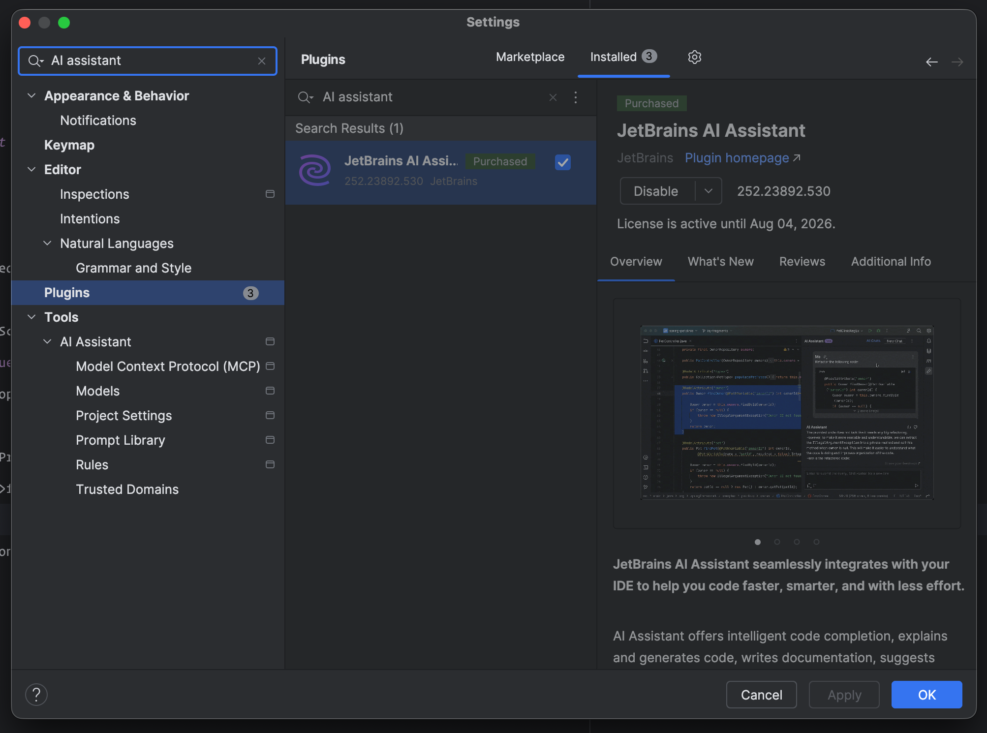 Якщо вам потрібно вручну активувати його, перейдіть до Налаштування -> Плагіни -> JetBrains AI Assistant: