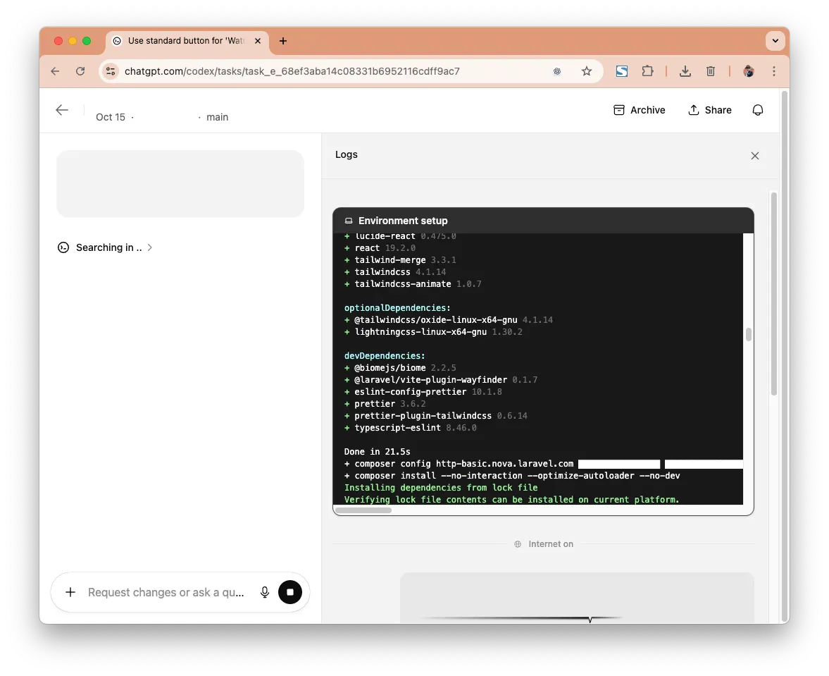 Приватні пакети (як Laravel Nova) потребують облікові дані під час установки. У Codex Web секрети доступні лише на етапі Налаштування. Якщо ви спробуєте встановити Nova пізніше, авторизація буде недоступна, і Composer видасть помилку 401. Цей посібник пропонує перевірену структуру, яку можна скопіювати для вашого проекту на Laravel.